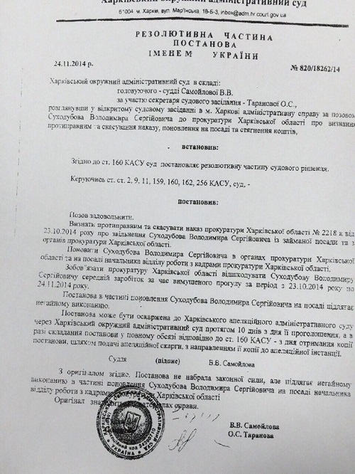 Рішенням Харківського окружного адмінсуду на роботі був відновлений Володимир Суходубов, до звільнення займав посаду начальника відділу по роботі з кадрами обласної прокуратури.