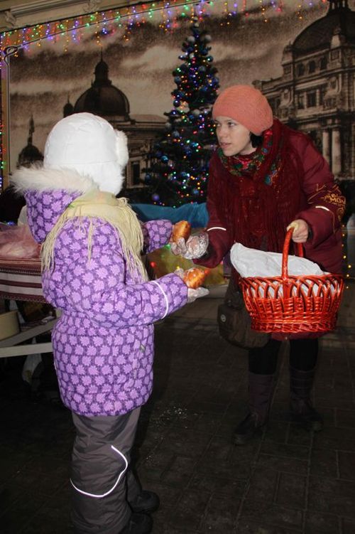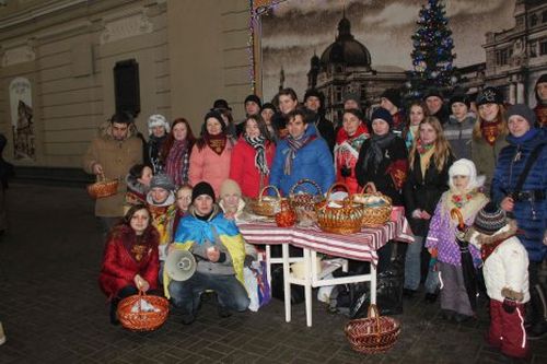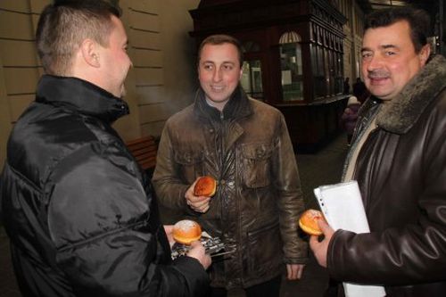 Мешканці Львова роздали 500 пампухів пасажирам поїзда № 111 "Харків-Львів", який прибув на перший перон головного залізничного вокзалу в 13:28, з приводу Дня соборності і свободи.