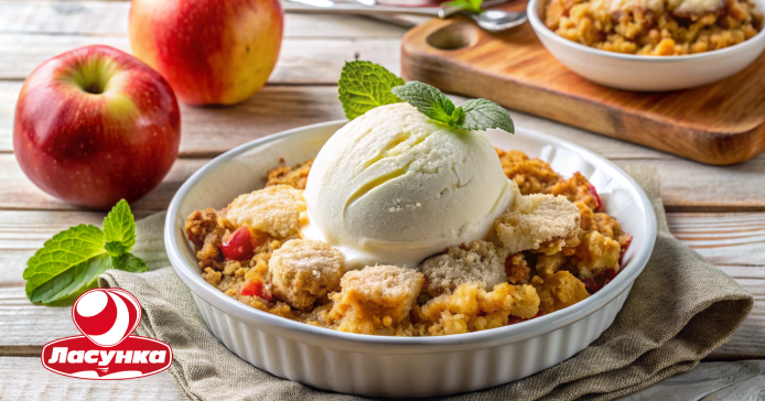 Подавайте гарячим, додавши вершки або морозиво, щоб зробити крамбл ще смачнішим! Радимо купити морозиво з ванільним смаком, наприклад, пломбір від ТМ «Ласунка» буде чудовим доповненням до цього десерту.