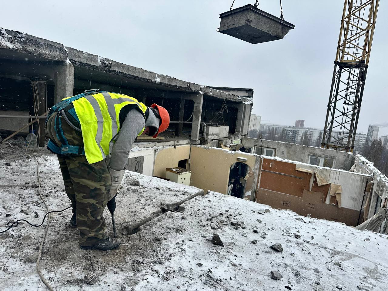 В одному з будинків на Північній Салтівці фахівці демонтують пошкоджені конструкції одного з підʼїздів житлового будинку, який зазнав прямих влучань ворожої артилерії на початку війни. Після демонтажу там почнуться роботи з відновлення, зокрема відбудова внутрішніх та зовнішніх стін, плит перекриття, монтаж скління, ремонт вхідних груп, комунікацій тощо.