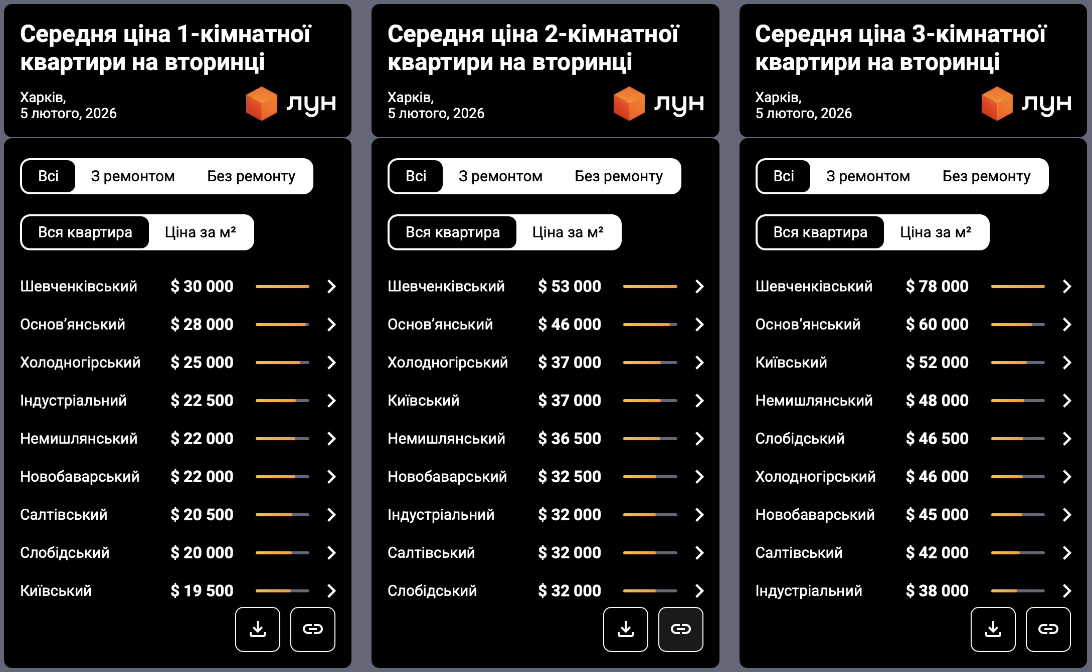 Середня ціна однокімнатної квартири найбільш високою залишається у Шевченківському районі — $30 000. Трохи дешевше житло пропонують в Основʼянському ($28 000) та Холодногірському ($25 000) районах. Найнижчі ціни на однокімнатні квартири зафіксовані у Київському районі — $19 500, Слобідському — $20 000 та Салтівському — $20 500.