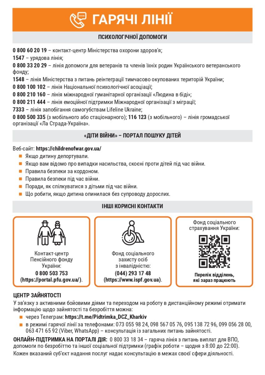 У місті Харків для вимушених переселенців створили довідник, який містить корисні контакти, адреси, гарячі лінії психологічної допомоги тощо.