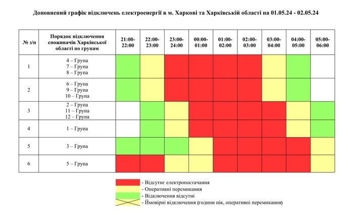 1 травня графік погодинних відключень буде розширено з урахуванням нічних годин та буде діяти до ранку 2 травня.
