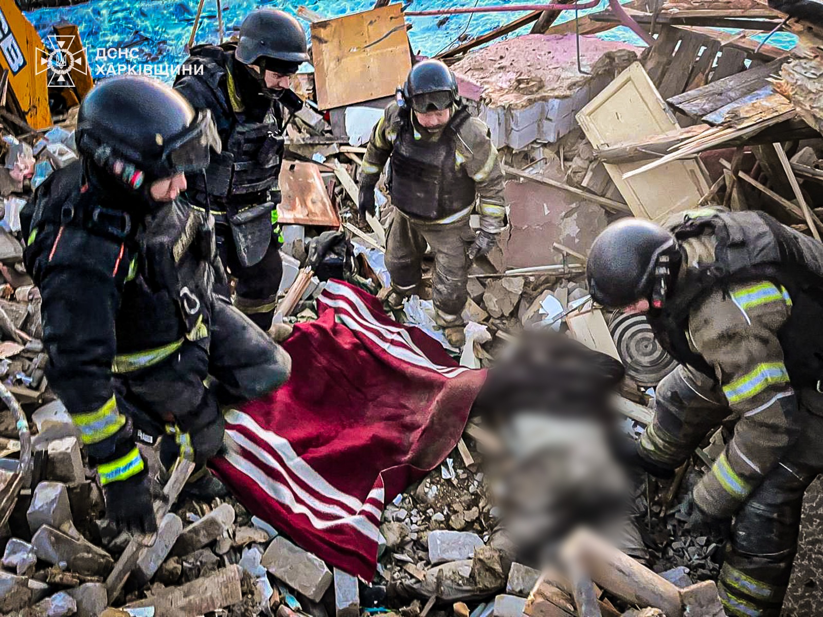 Рятувальники деблокують тіло чоловіка після обстрілу Куп'янська / Фото: ДСНС Харківщини