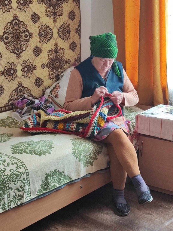 Серед слухачів – Алла Михайлівна Михайлова із Золочева. Вона приїхала до стаціонарного відділення зовсім недавно, на початку травня. Розповідає, що декілька років перед війною жила у прикордонному селі Олександрівка Золочівської громади. На початку війни потрапила до Золочева, там жили в підвальному приміщенні в дитсадку. Восени їх перевезли до Богодухова, а тепер сюди, у Краснокутську громаду.