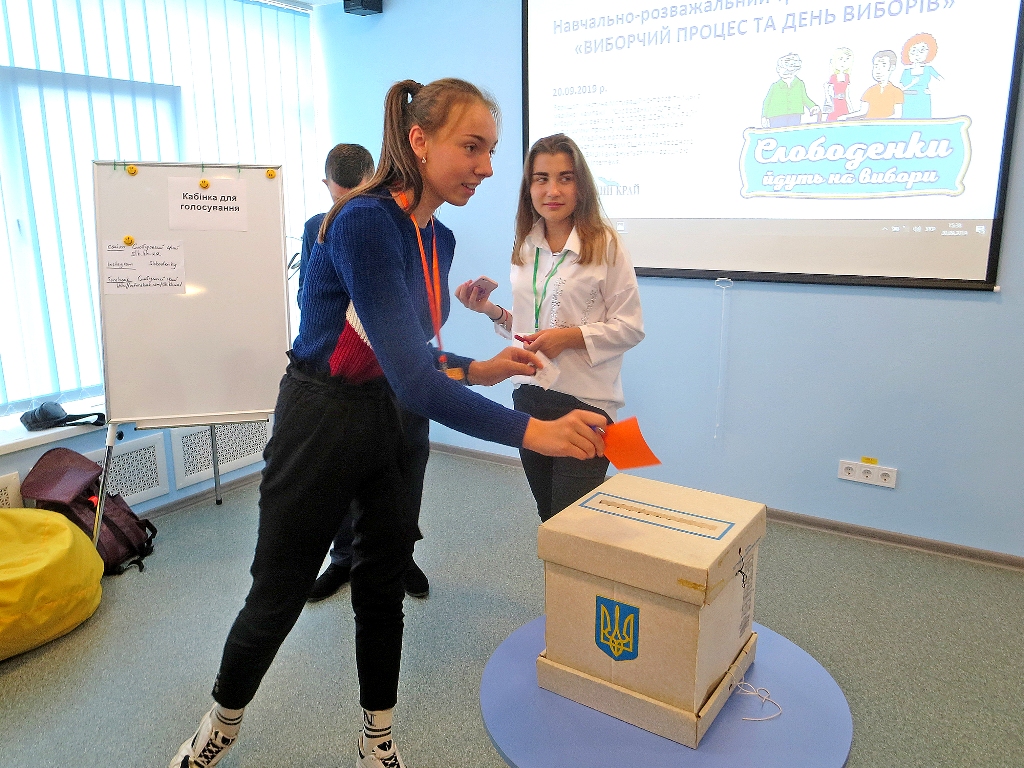 А щоб закріпити під час тренінгу здобуті знання, модератори провели рольову гру, під час якої всі учасники змогли віддати голос за кандидата. Так, троє школярів балотувалися в народні депутати. Вони провели перед своїми виборцям виборчу кампанію та агітацію.